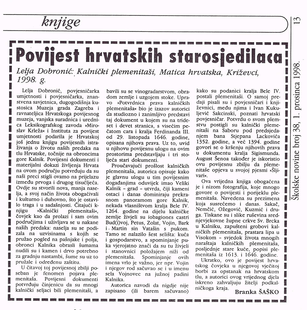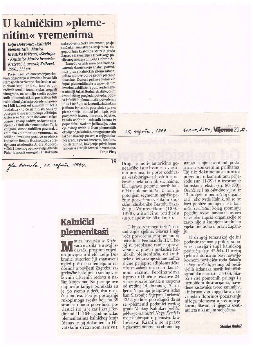 1998. / Predstavljanje publikacija Predstavljanje knjige „Kalnički plemenitaši” 24/11/199824/01/2021 martinarebic Ogranak MH u Križevcima organizirao je 24. studenog 1998. u gradskoj vijećnici predstavljanje knjige Lelje Dobronić „Kalnički plemenitaši”. O knjizi su govorili: autorica Lelja Dobronić, Žarko Domljan, Renata Husinec i Ante Rendić-Miočević. Podjeli ovo: Share on X(Otvara se u novom prozoru) X Podijeli na Facebooku (Otvara se u novom prozoru) Facebook Lajk Učitavanje...