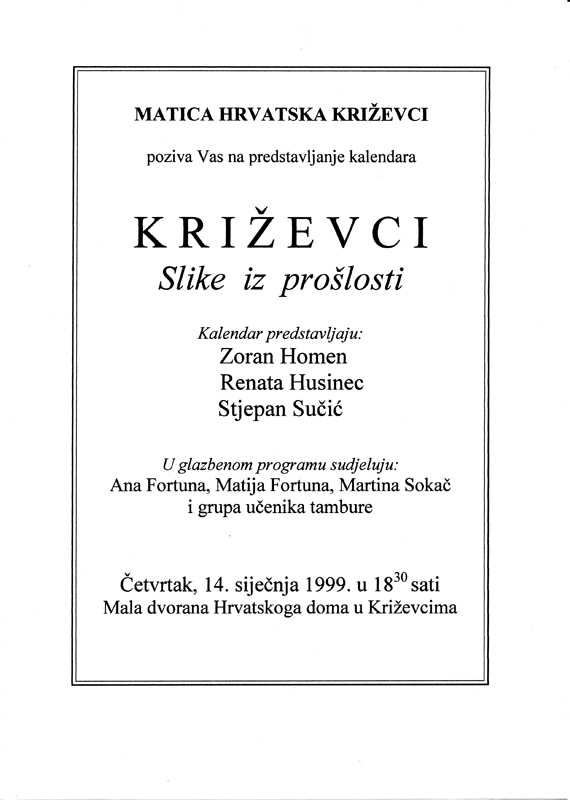 Matica hrvatska predstavila je u četvrtak, 14. siječnja 1999. u maloj dvorani Hrvatskoga doma u Križevcima kalendar za 1999. godinu pod nazivom Križevci – slike iz prošlosti. O kalendaru su govorili Zoran Homen, Renata Husinec i Stjepan Sučić. U glazbenom dijelu programa sudjelovali su Ana Fortuna, Matija Fortuna, Martina Sokač, Katarina Pohl i grupa učenika tambure.