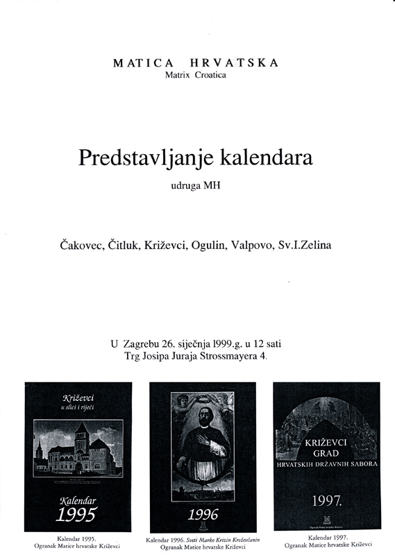 U Zagrebu je 26. siječnja 1999. održano predstavljanje kalendara udruga MH Čakovec, Čitluk, Križevci, Ogulin, Valpovo i Sv. Ivan Zelina.