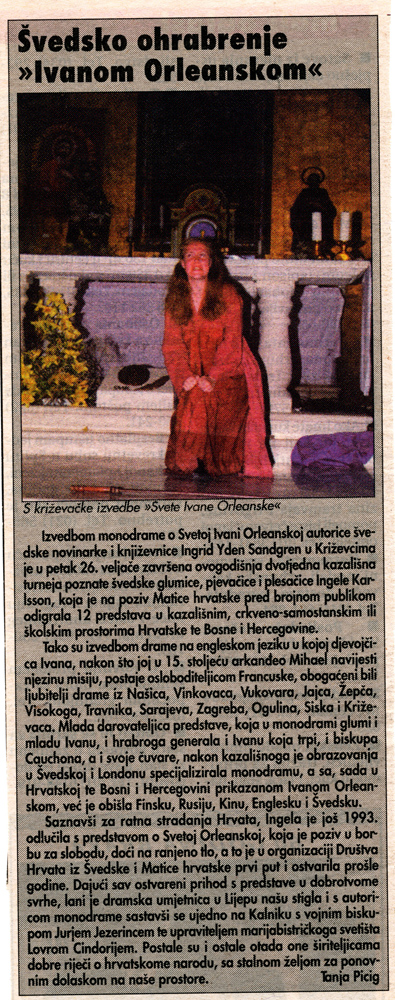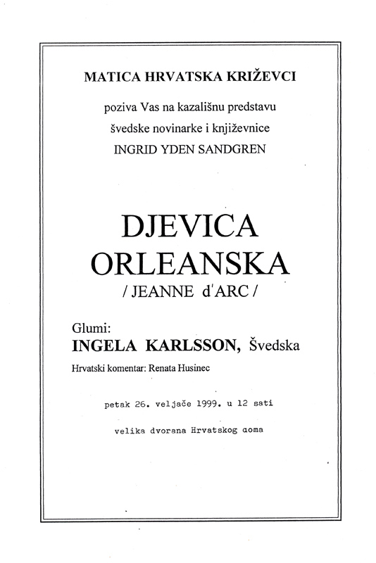 U Križevcima je u velikoj dvorani Hrvatskoga doma u petak, 26. veljače 1999. odigrana monodrama švedske glumice Ingele Karlsson Djevica Orleanska. Ovo je bila posljednja u nizu od dvanaest predstava o francuskoj svetici odigranih pred hrvatskom publikom u organizaciji Društva Hrvata iz Švedske i Matice hrvatske.