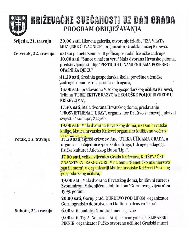 U povodu Dana grada, 23. travnja 1999. Matica hrvatska Križevci, Visoko gospodarsko učilište u Križevcima i Odjel za prirodoslovlje i matematiku Matice hrvatske organizirali su četvrte Križevačke znanstvene razgovore s temom Genetičko inženjerstvo – san ili mora. Skup se održao u gradskoj vijećnici, a izlagali su Marijan Jošt, Marko Tarle i Slavko Kulić. Uvodnu riječ održali su Renata Husinec, predsjednica MH Križevci i Ljudevit Plačko, dekan VGU-a u Križevcima.