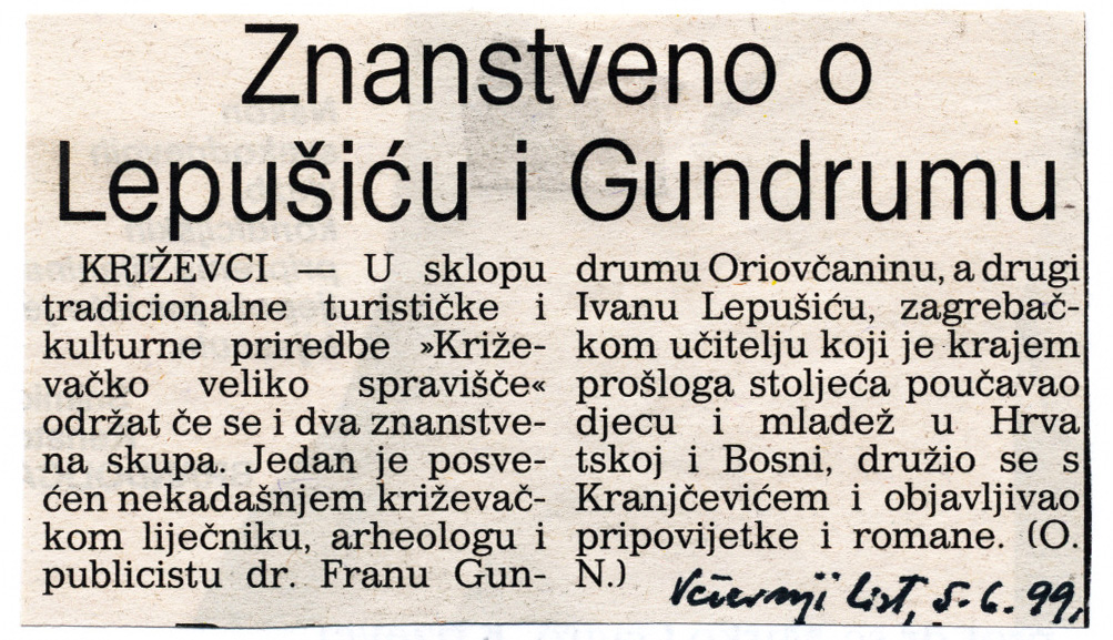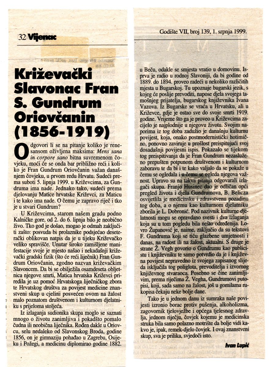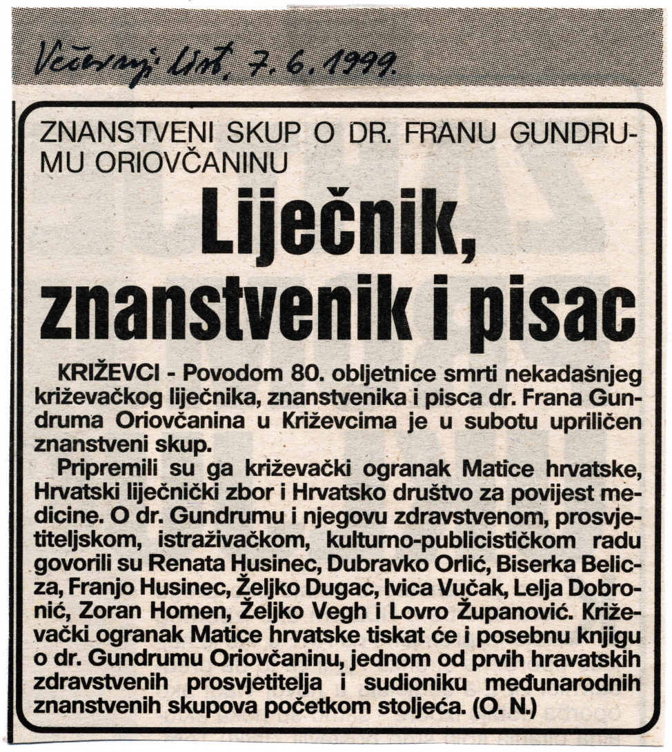 Matica hrvatska Križevci, Liječnički zbor – Podružnica Koprivnica, Hrvatsko društvo za povijest medicine – Hrvatski liječnički zbor organizirali su 5. lipnja 1999. u Gradskoj vijećnici Grada Križevaca znanstveni skup o Franju Gundrumu-Oriovčaninu. Nakon pozdravne riječi organizatora – Renate Husinec, Dubravka Orlića i Biserke Belicze – održano je sedam izlaganja: Biserke Belicze, Franje Husinca, Željka Dugaca i Ivice Vučaka, Lelje Dobronić, Zorana Homena, Željka Vegha i Lovre Županovića.