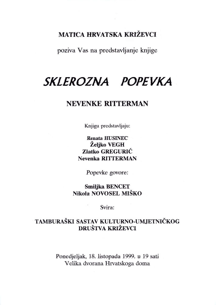 Matica hrvatska Križevci predstavila je u velikoj dvorani Hrvatskoga doma 18. listopada 1999. knjigu Sklerozna popevka Nevenke Ritterman. Knjigu su predstavili Renata Husinec, Željko Vegj, Zlatko Gregurić i sama autorica, a popevke su govorili Smiljka Bencet i Nikola Novosel – Miško. Glazbeni obol da je tamburaški sastav Kulturno-umjetničkog društva Križevci.