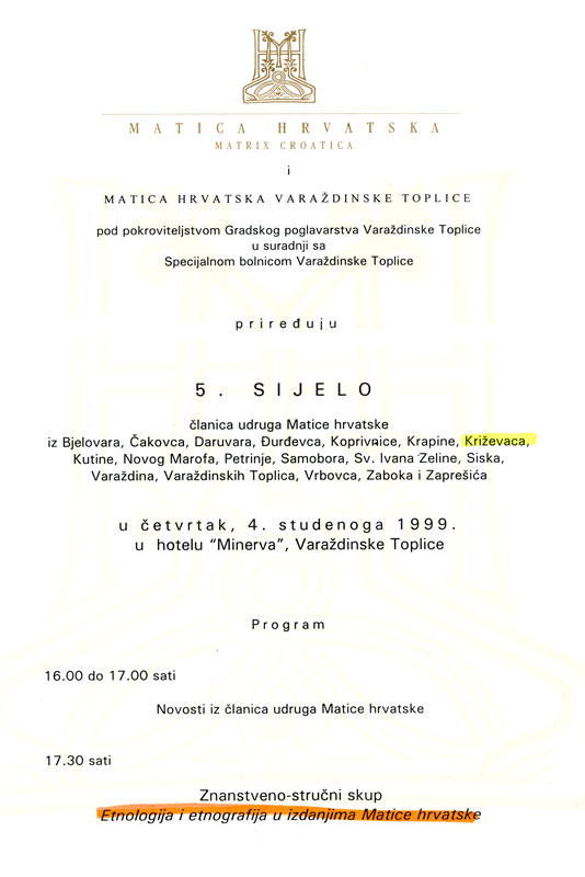 Matica hrvatska Križevci sudjelovala je 4. studenog 1999. u Varaždinskim Toplicama na 5. sijelu članica udruga Matica hrvatske iz Bjelovara, Čakovca, Daruvara, Đurđevca, Koprivnice, Krapine, Križevaca, Kuzine, Novog Marofa, Petrinje, Samobora, Sv. Ivana Zeline, Siska, Varaždina, Varaždinskih Toplica, Vrbovca, Zaboka i Zaprešića.
