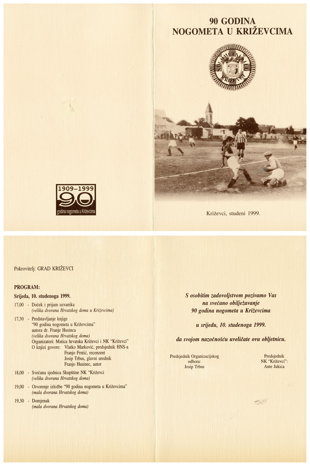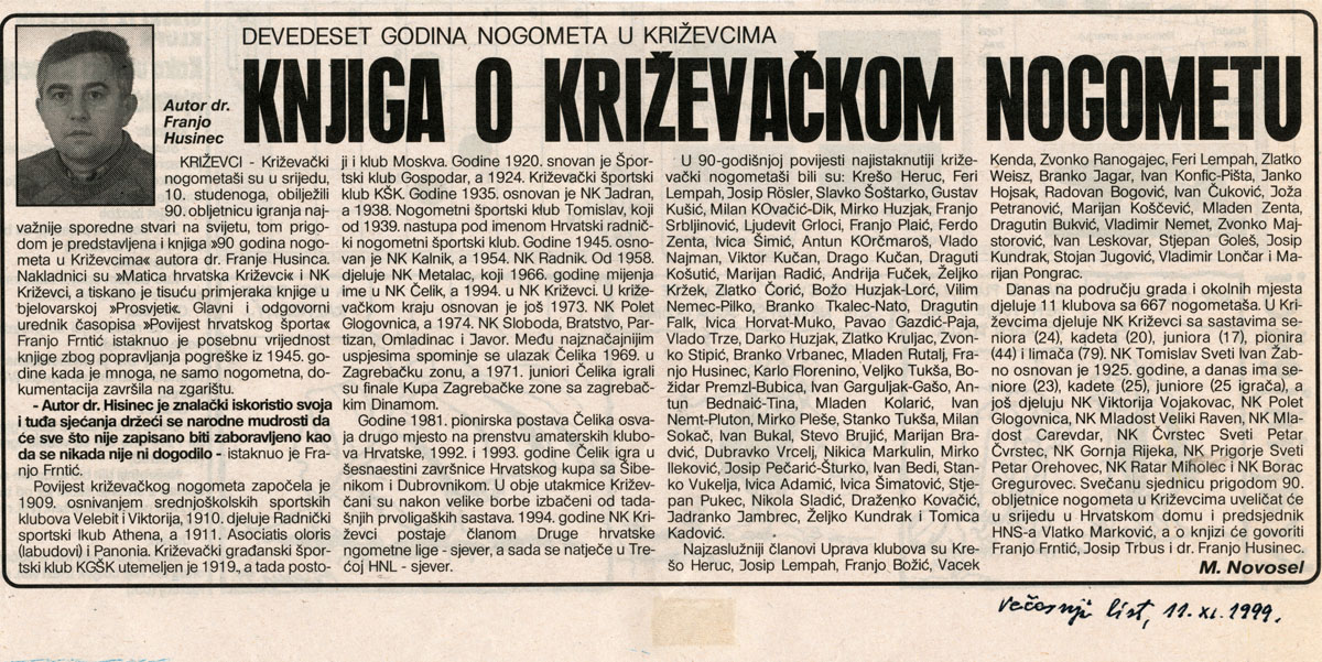 U velikoj dvorani Hrvatskoga doma u organizaciji Matice hrvatske Križevci i Nogometnog kluba Križevci predstavljena je u srijedu, 10. studenog 1999. knjiga Franje Husinca 90 godina nogometa u Križevcima. O knjizi su govorili Vlatko Marković, predsjednik HNS-a, Franjo Frntić, recenzent, Josip Trbus, glavni urednik i sam autor Franjo Husinec.