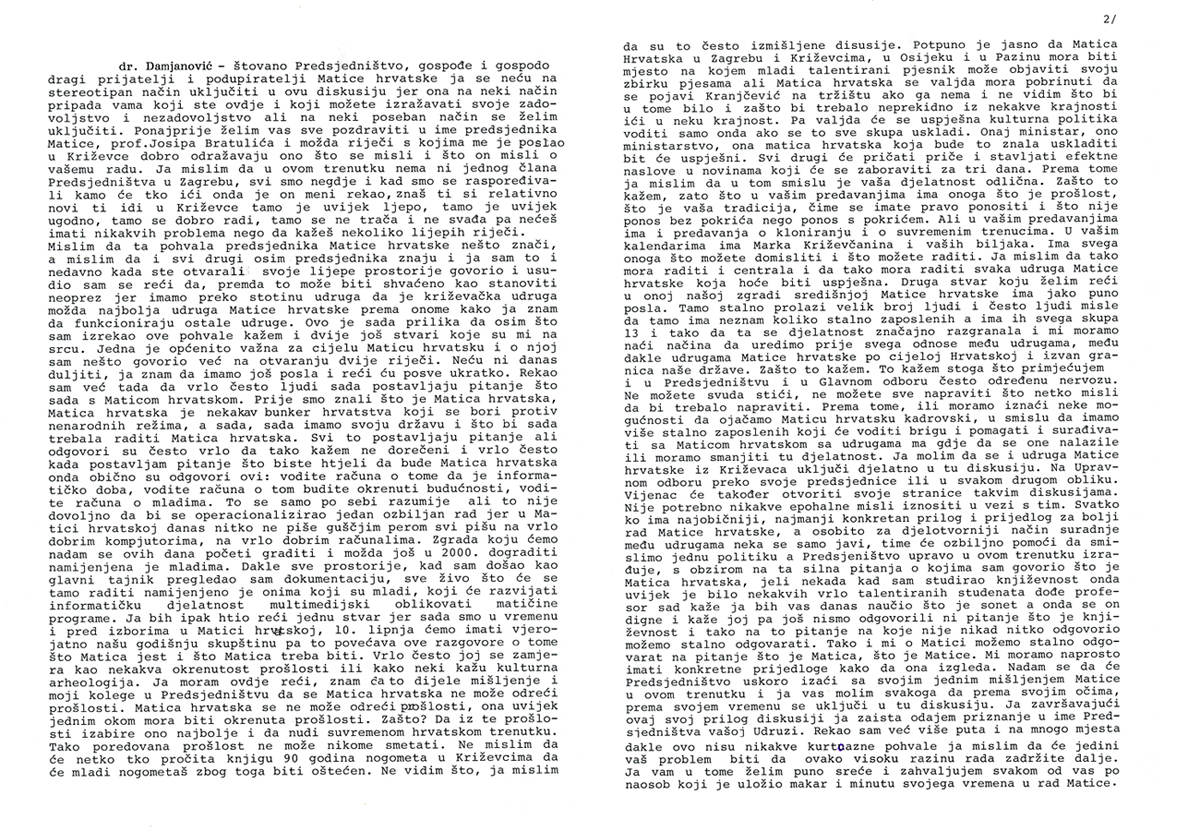 U maloj dvorani Hrvatskog doma održana je 23. veljače 2000. godišnja skupština Matice hrvatske Križevci. Skupštinom je rukovodilo predsjedništvo u sastavu Renata Husinec, predsjednica, Stjepan Palijan, član i Josip Trbus, član. Kao gost skupštini je nazočio glavni tajnik Stjepan Damjanović.