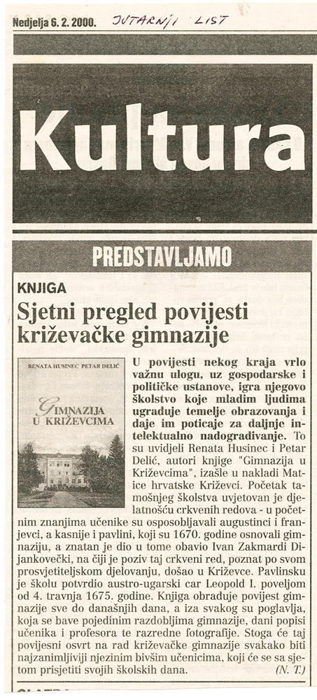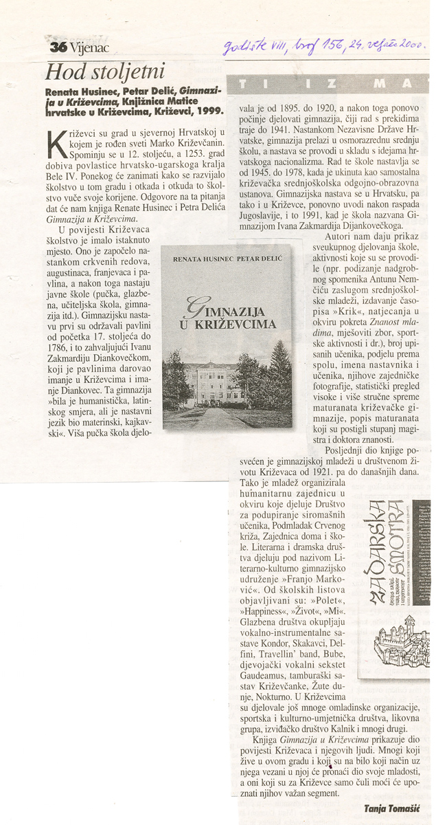 U Vijencu 24. veljače 2000. i Jutarnjem listu 6. veljače 2000. objavljeni su prikazi knjige „Gimnazija u Križevcima” Petra Delića i Renate Husinec.