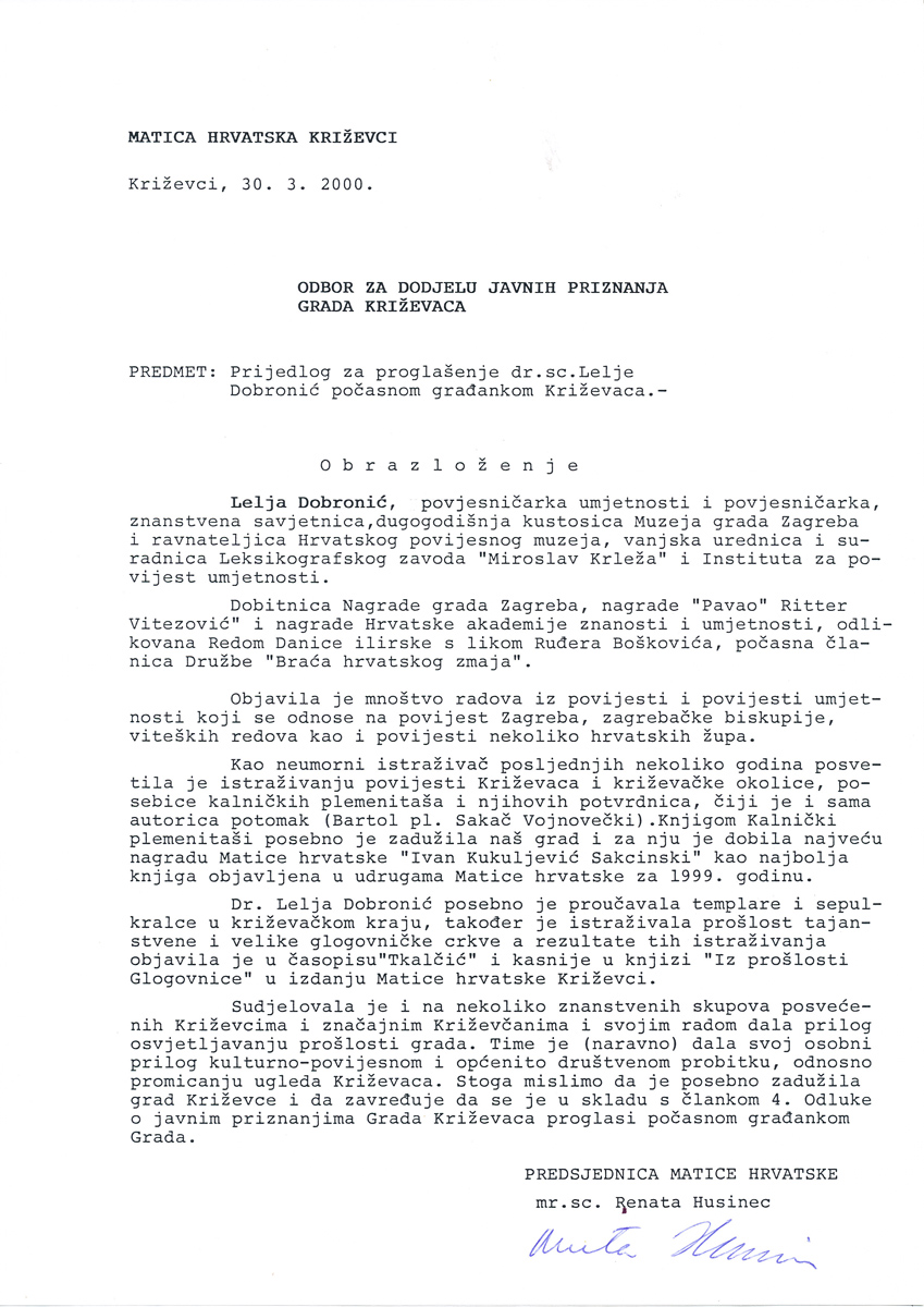 Gradsko poglavarstvo Grada Križevaca dodijelilo je 24. travnja 2000., na 748. obljetnicu proglašenja Križevaca slobodnim kraljevskim gradom, javna priznanja i nagrade zaslužnim građanima i društvima. Na prijedlog Matice hrvatske Križevci plaketu Grada Križevaca dobilo je Hrvatsko pjevačko društvo „Kalnik” te je dr. sc. Lelja Dobronić proglašena počasnom građankom Križevaca.