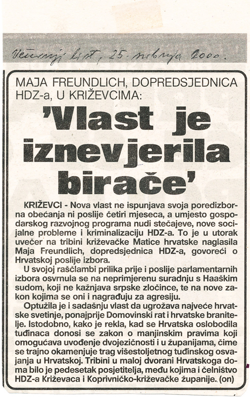 U organizaciji Matice hrvatske Križevci održana je 23. svibnja 2000. u maloj dvorani Hrvatskoga doma tribina „Hrvatska poslije izbora”, na kojoj je govorila Maja Freundlich, dopredsjednica HDZ-a. Pozdravnu riječ uputila je predsjednica ogranka MH Renata Husinec.