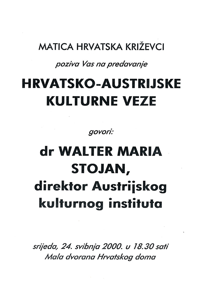 U maloj dvorani Hrvatskoga doma u srijedu, 24. svibnja 2000. održano je predavanje „Hrvatsko-austrijske kulturne veze”. Govorio je dr. Walter Stojan, direktor Austrijskog kulturnog instituta te uime organizatora predsjednica Matice hrvatske Križevci Renata Husinec.