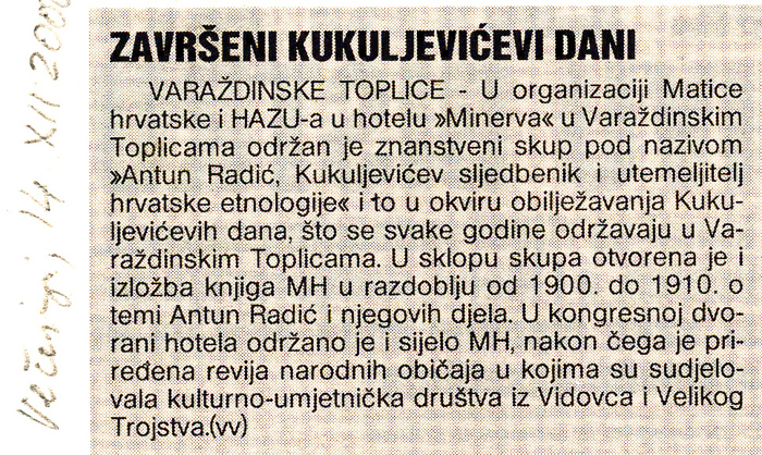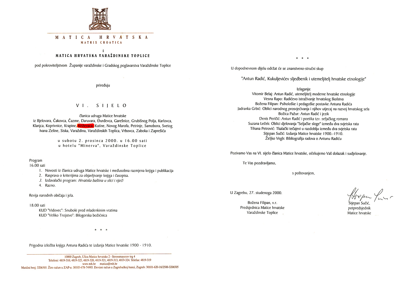 Matica hrvatska i Matica hrvatska Varaždinske Toplice pod pokroviteljstvom Županije varaždinske i Gradskog poglavarstva Varaždinske Toplice priredile su 2. prosinca 2000. VI. sijelo članica udruge Matice hrvatske iz Bjelovara, Čakovca, Čazme, Daruvara, Đurđevca, Garešnice, Grubišnog Polja, Karlovca, Klanjca, Koprivnice, Krapine, Križevaca, Kutine, Novog Marofa, Petrinje, Samobora, Svetog Ivana Zeline, Siska, Varaždina, Varaždinskih Toplica, Vrbovca, Zaboka i Zaprešića.