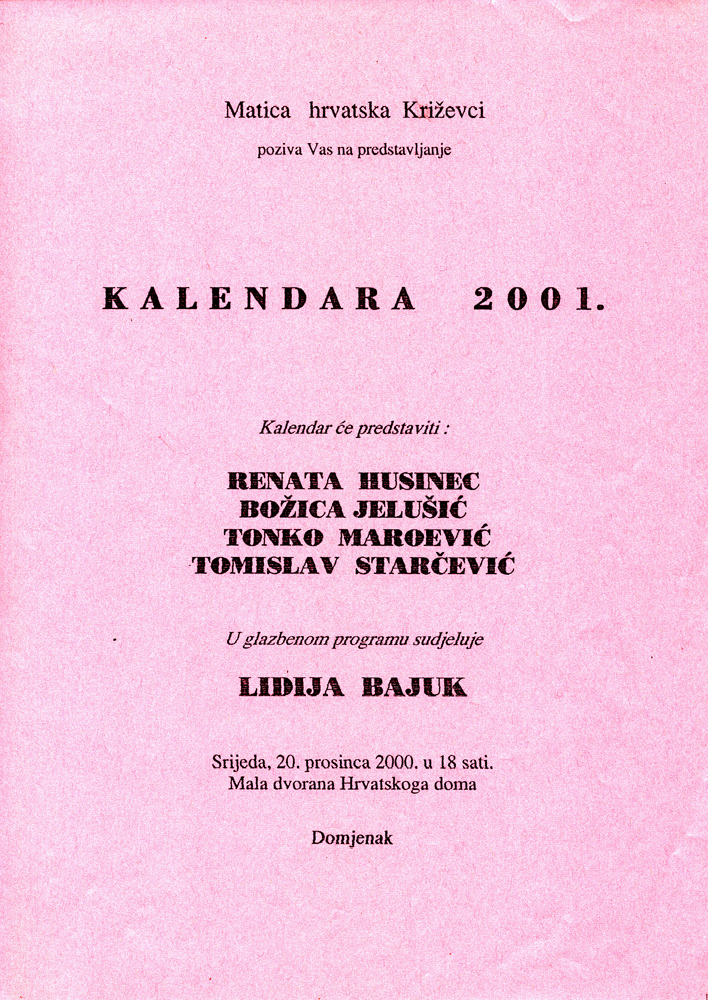 Matica hrvatska Križevci predstavila je kalendar za 2001. godinu. U maloj dvorani Hrvatskoga doma 20. prosinca 2000. o kalendaru su govorili Renata Husinec, Božica Jelušić, Tonko Maroević i Tomislav Starčević. U glazbenom dijelu programa nastupila je Lidija Bajuk.