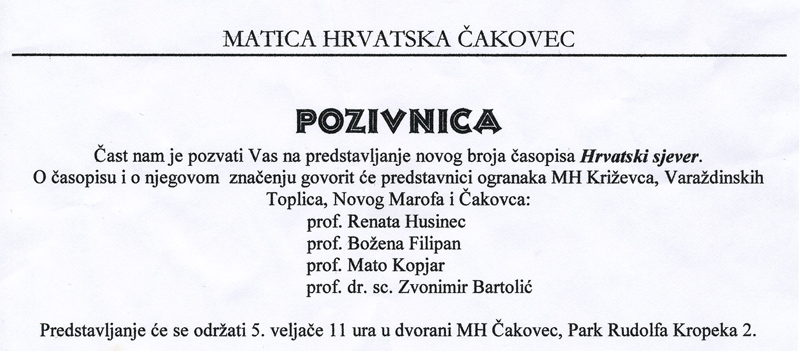 U organizaciji Matice hrvatske Čakovec održano je 5. veljače 2002. predstavljanje časopisa Hrvatski sjever u nakladništvu ogranaka Matice hrvatske sjeverozapadne Hrvatske: Čakovca, Križevaca, Novog Marofa i Varaždinskih Toplica. O časopisu su govorili predstavnici ogranaka: Renata Husinec (Križevci), Božena Filipan (Varaždinske Toplice), Mato Kopjar (Novi Marof) i Zvonimir Bartolić (Čakovec), koji je glavni i odgovorni urednik.