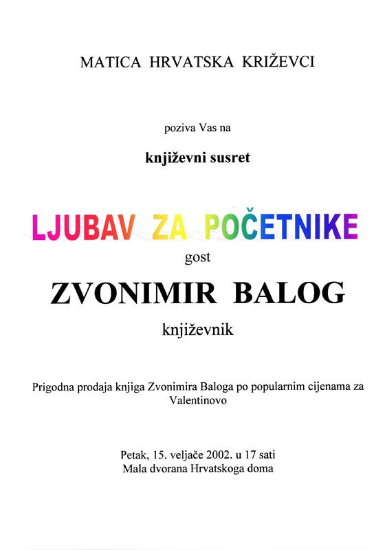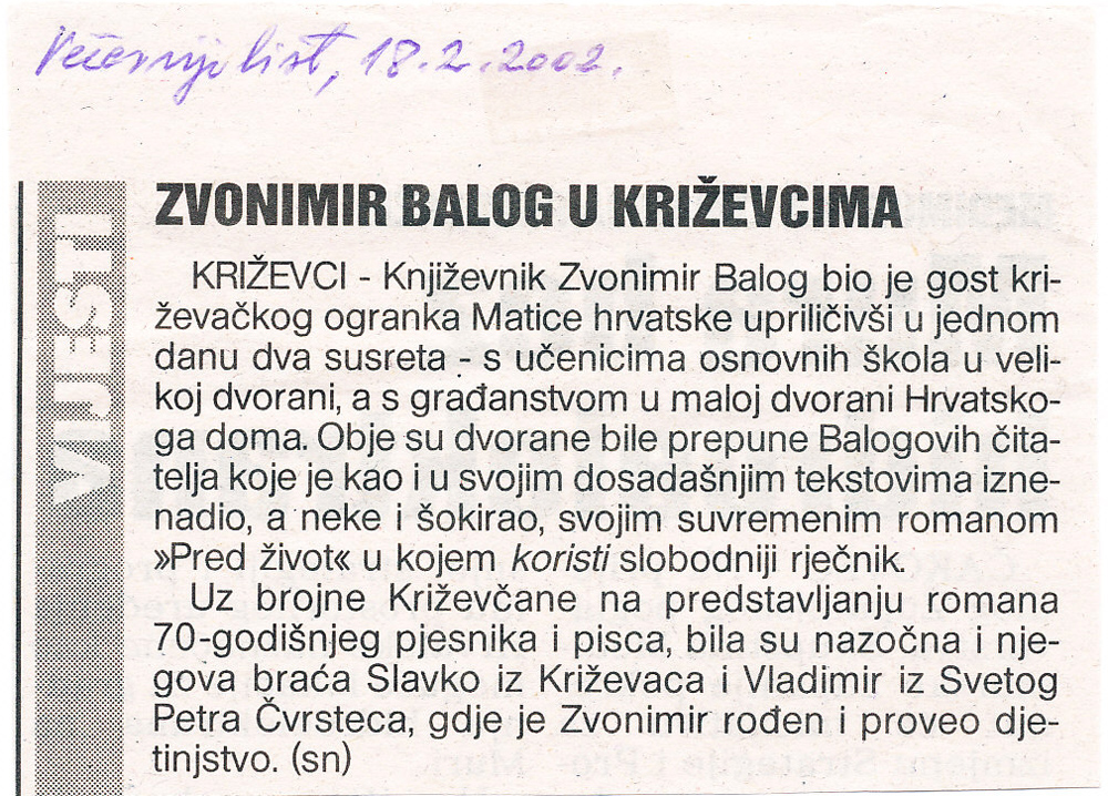 Književnik Zvonimir Balog bio je 15. veljače 2002. gost križevačkog ogranka Matice hrvatske upriličivši u jednome danu dva susreta – u velikoj dvorani Hrvatskoga doma za učenike osnovnih škola i u maloj dvorani za građanstvo. Obje su dvorane bile prepune Balogovih čitatelja, kojima je predstavio suvremeni roman Pred život.