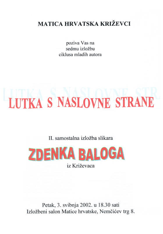 2002. / Ciklus mladih autora / Izložbe Izložba Zdenka Baloga 03/05/200213/07/2016 martinarebicKomentiraj U petak 3. svibnja 2002. otvorena je sedma izložba u Ciklusu mladih autora salona Matice hrvatske Križevci. Izložba Zdenka Baloga nosi naslov Lutka s naslovne strane, i to je druga dosad samostalna Balogova izložba. Plakat Katalog izložbe Lajk Učitavanje...
