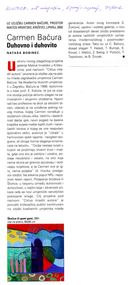 2002. / Ciklus mladih autora / Izložbe Izložba Carmen Bačure 30/05/200206/06/2016 martinarebicKomentiraj U Ciklusu mladih autora galerije Matice hrvatske Križevci otvorena je 30. svibnja 2002. izložba ulja na platnu mlade zagrebačke umjetnice Carmen Bačure. Tekst u katalogu potpisuje Anamarija Hucika. Katalog izložbe Tekst u Konturi Lajk Učitavanje...