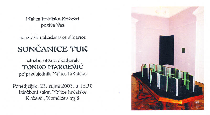U izložbenom salonu Matice hrvatske Križevci otvorena je 23. rujna 2002. izložba akademske slikarice Sunčanice Tuk. Izložbu je, u odsutnosti akademika Tonka Maroevića koji je autor tekst u katalogu izložbe, otvorio Marijan Špoljar. Ova je izložba deseta po redu u „Ciklusu mladih autora” koji priprema Saša Živković.