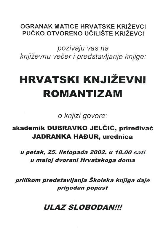U organizaciji Matice hrvatske Križevci u maloj dvorani Hrvatskoga doma 25. listopada 2002. predstavljena je knjiga Hrvatski književni romantizam. O knjizi su govorili akademik Dubravko Jelčić, koji je knjigu priredio, i Jadranka Hađur, urednica u Školskoj knjizi.