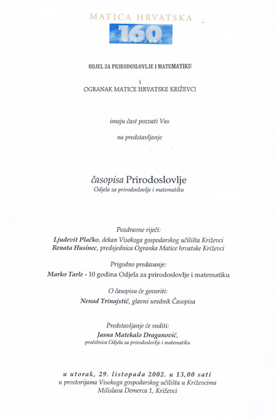 Matica hrvatska Križevci i Visoko gospodarsko učilište Križevci organizirali su 29. listopada 2002. gostovanje Odjela za prirodoslovlje i matematiku Matice hrvatske. Prisutne je pozdravio dekan učilišta prof. dr. Ljudevit Plačko i predsjednica ogranka Matice hrvatske Križevci Renata Husinec, a o deset godina uspješna rada Odjela govorio je nekadašnji pročelnik Odjela dr. Marko Tarle.