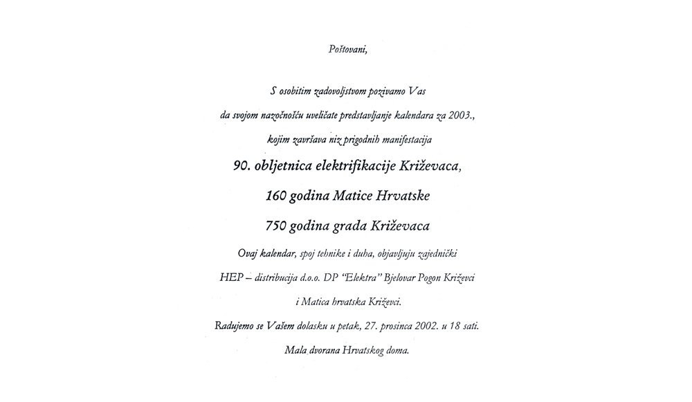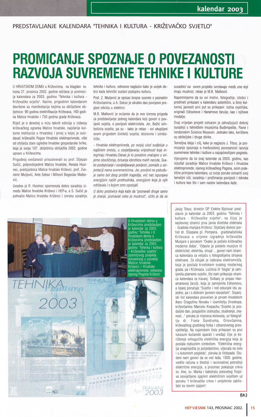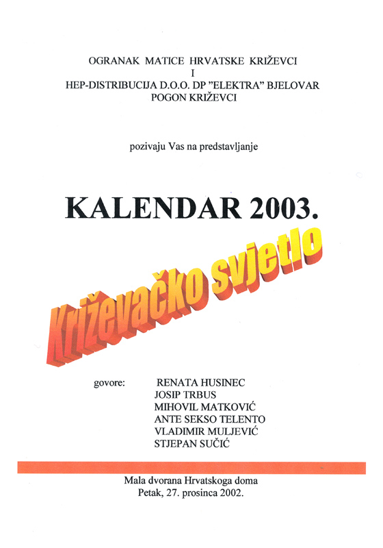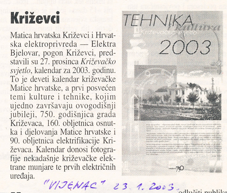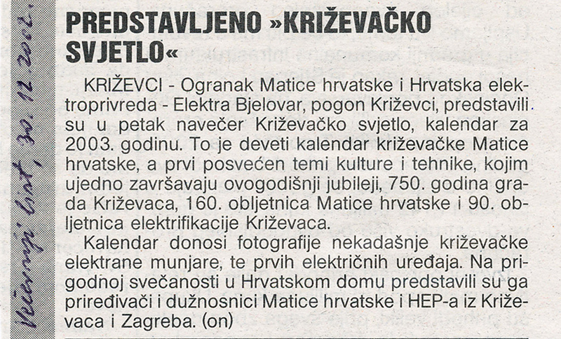 Ogranak Matice hrvatske Križevci i Hrvatska elektroprivreda – Elektra Bjelovar, pogon Križevci predstavili su u petak 27. prosinca 2002. Tehnika i kultura – Križevačko svjetlo, kalendar za 2003. godinu. Govorili su Stjepan Sučić, potpredsjednik Matice hrvatske, Renata Husinec, predsjednica križevačkog ogranka, Josip Trbus, direktor Elektre Bjelovar, prof. Zvonimir Muljević, Ante Sekso i Mihovil Bogoslav Matković.
