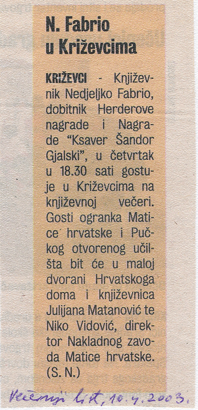U četvrtak 10. travnja 2003. križevački Ogranak Matice hrvatske i Pučko otvoreno učilište organizirali su književnu večer na kojoj je gostovao Nedjeljko Fabrio, književnik i dobitnik Herderove nagrade i Nagrade „Ksaver Šandor Gjalski”. Uz Fabria govorili su i književnica Julijana Matanović i direktor Nakladnog zavoda Matice hrvatske Niko Vidović.
