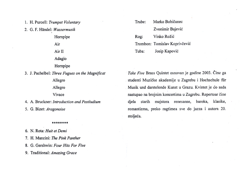 Take five Brass Quintet, koji čine studenti Muzičke akademije u Zagrebu i Hochschule fur Musik und darstelende Kunst u Grazu, čiji repertoar čine djela starih majstora renesanse, baroka, klasike, romantizma, preko ragtimea sve do jazza i autora 20. stoljeća, održao je 11. lipnja 2003. u Maloj dvorani Hrvatskoga doma u Križevcima koncert, čiji su organizatori bili Ogranak Matice hrvatske Križevci i Gradski puhački orkestar Križevci.