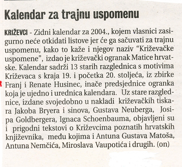 Ogranak Matice hrvatske Križevci izdao je zidni kalendar za 2004. pod nazivom „Križevačke uspomene”. Kalendar sadrži 13 starih razglednica s motivima Križevaca s kraja 19. i početka 20. stoljeća, iz zbirke Franje i Renate Husinec, predsjednice Ogranka, koja je ujedno i urednica kalendara. Uz razglednice su objavljeni i prigodni tekstovi o Križevcima poznatih hrvatskih književnika, među kojima i Antuna Gustava Matoša, Antuna Nemčića, Miroslava Vaupotića i drugih.