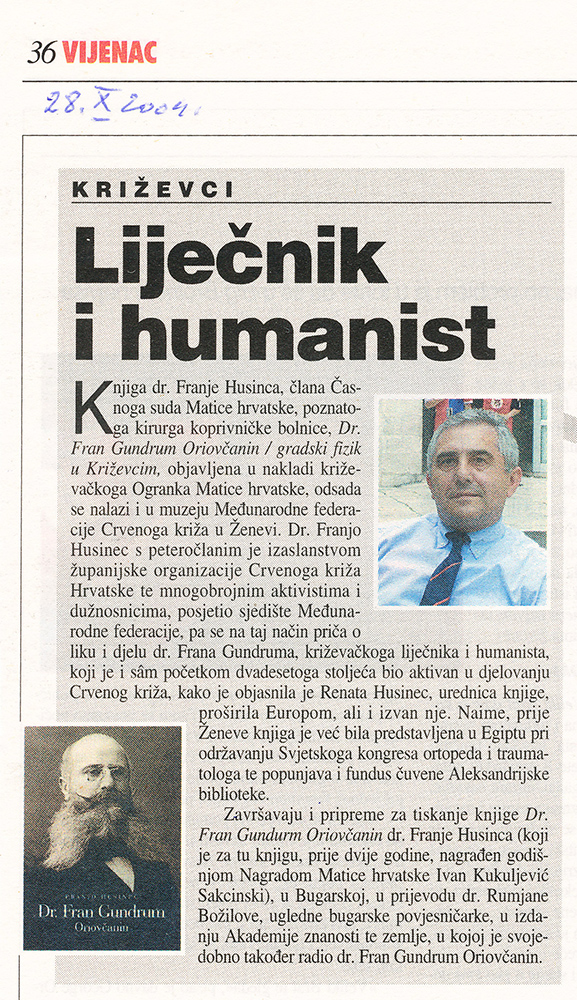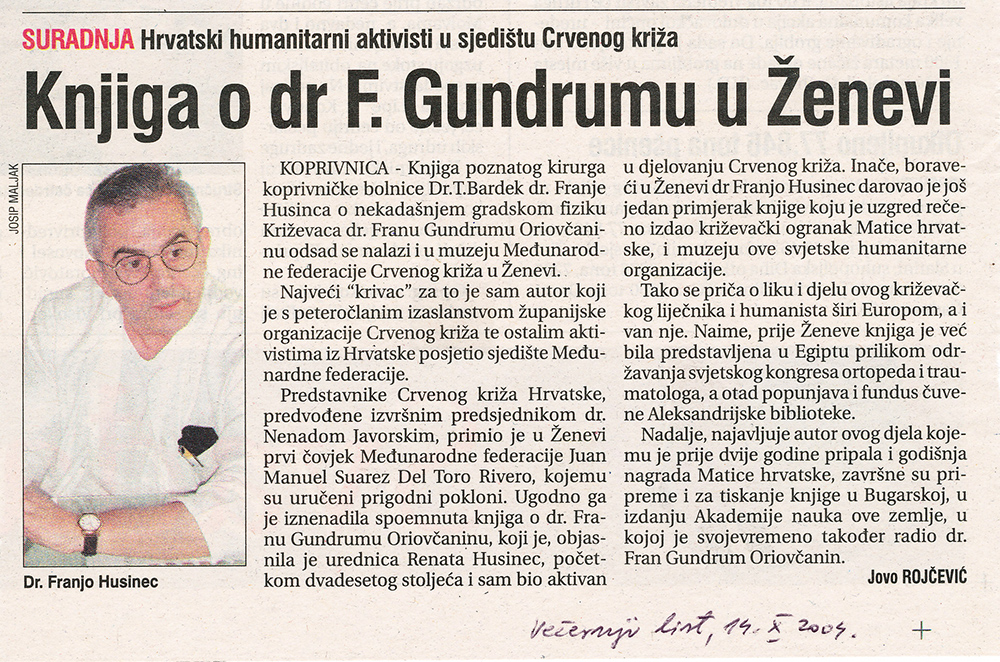 Dr. Franjo Husinec s peteročlanim je izaslanstvom županijske organizacije Crvenoga križa Hrvatske te mnogobrojnim aktivistima i dužnosnicima posjetio sjedište Međunarodne federacije Crvenog križa te darovao svoju knjigu „Dr. Fran Gundrum Oriovčanin” tamošnjem muzeju.