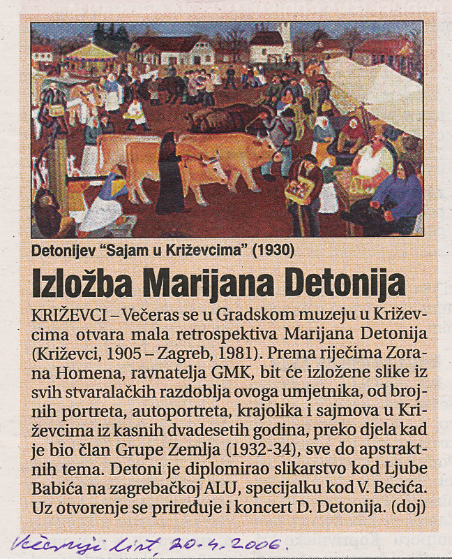 Povodom 101. godišnjice rođenja križevačkog slikara Marijana Detonija Ogranak MH u Križevcima i Gradski muzej Križevci organizirali su malu retrospektivu Detonijevih slika te koncert Danijela Detonija.