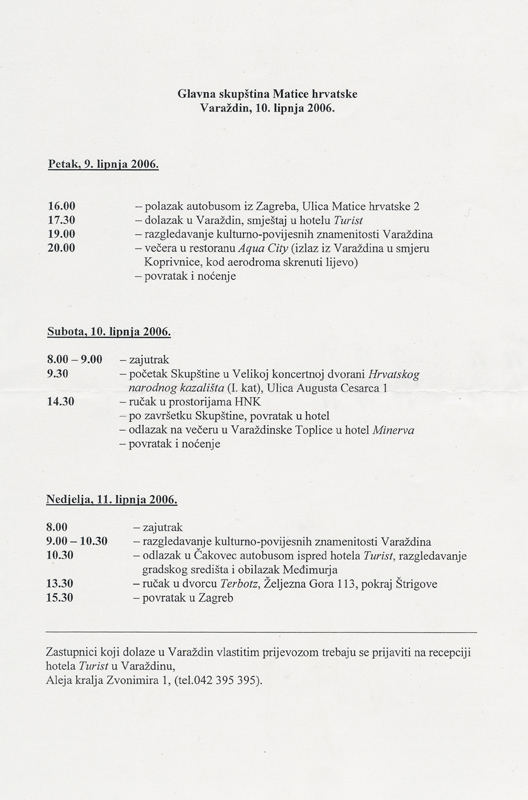 U Koncertnoj dvorani Hrvatskoga narodnog kazališta u Varaždinu održana je 10. lipnja 2006. Glavna skupština Matice hrvatske na kojoj su izabrana nova upravna tijela koja će Maticu hrvatsku voditi u naredne četiri godine. Na Skupštini je glasovalo ukupno 107 zastupnika.