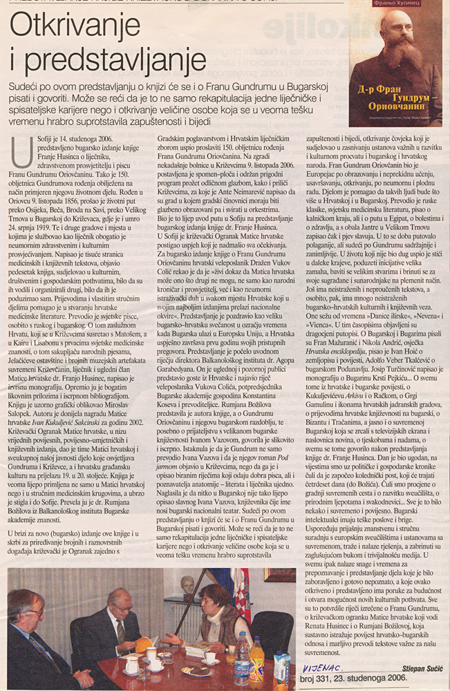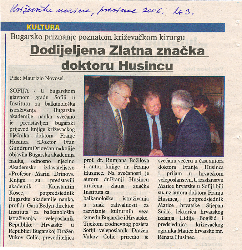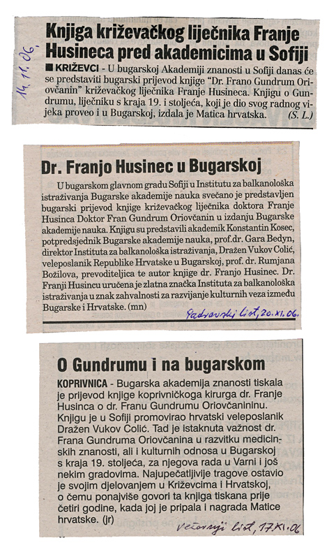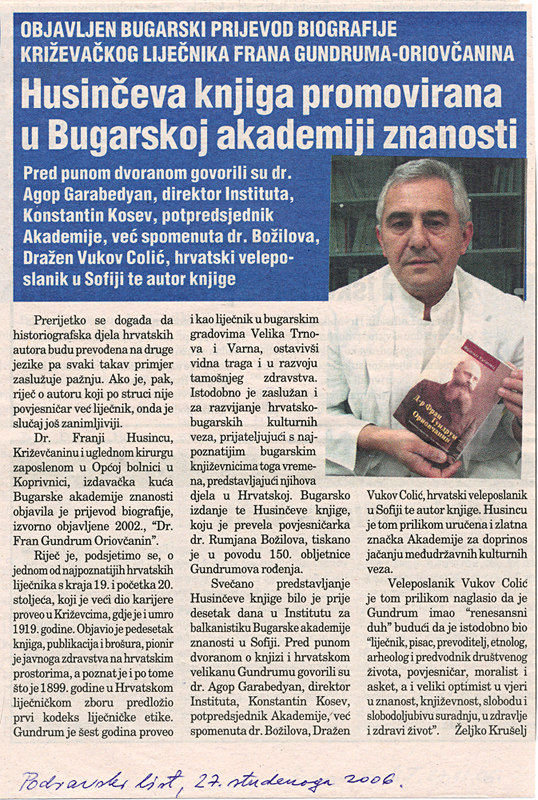 U Institutu za balkanološka istraživanja Bugarske akademije nauka 14. studenog 2006. svečano je predstavljen bugarski prijevod knjige križevačkog liječnika Franje Husinca „Dr. Fran Gundrum Oriovčanin”. Knjigu su uz autora predstavili potpredsjednik Bugarske akademije nauka akademik Konstantin Kosev, direktor Instituta za balkanološka istraživanja prof. dr. Agop Garabedian, veleposlanik Republike Hrvatske u Bugarskoj Dražen Vukov Colić i prevoditeljica prof. dr. Rumjana Božilova.