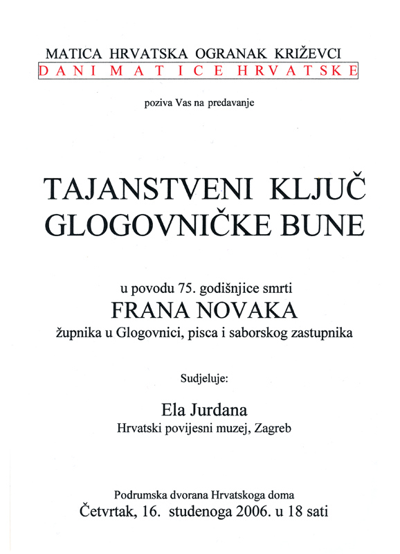 U sklopu obilježavanja Dana Matice hrvatske, a povodom 75. godišnjice smrti Frana Novaka, župnika u Glogovnici, pisca i saborskog zastupnika, organizirano je 16. studenog 2006. predavanje Ele Jurdane iz Hrvatskog povijesnog muzeja u Zagrebu.