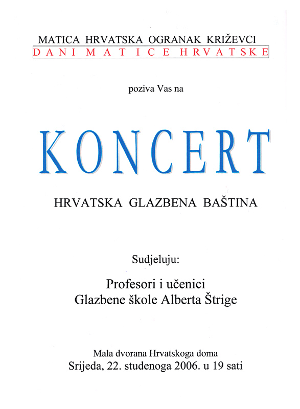 U sklopu Dana Matice hrvatske križevački Ogranak organizirao je 22. studenog 2006. koncert Hrvatska glazbena baština na kojemu su sudjelovali profesori i učenici Glazbene škole Alberta Štrige.