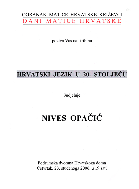 Ogranak Matice hrvatske u Križevcima povodom Dana Matice hrvatske organizirao je 23. studenog 2006. tribinu „Hrvatski jezik u 20. stoljeću”, na kojoj je govorila prof. Nives Opačić.