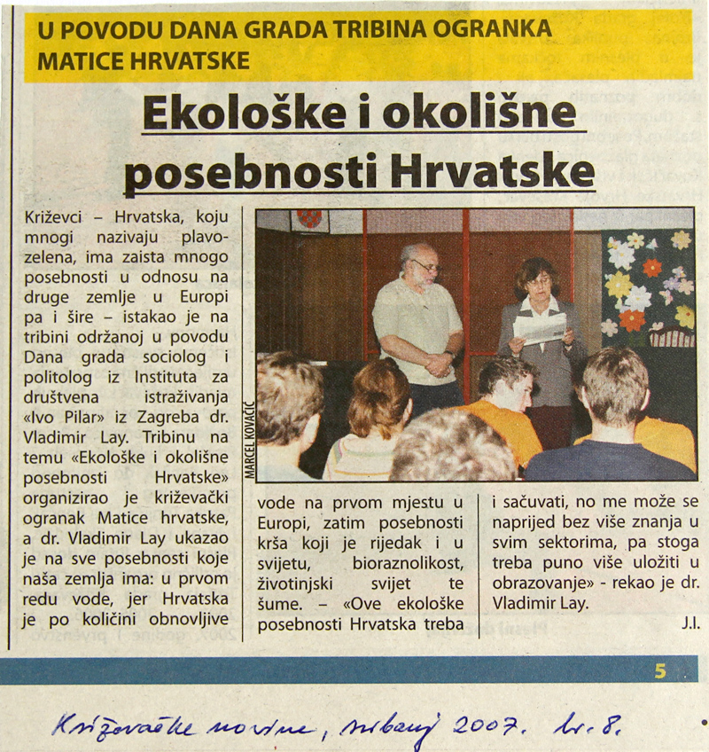 Ususret Danu planeta Zemlje i povodom Dana grada Matica hrvatska ogranak Križevci priredio je u četvrtak 19. travnja 2007. u maloj dvorani Hrvatskog doma predavanje naziva Ekološke i okolišne posebnosti Hrvatske. Gost-predavač bio je dr. Vladimir Lay s Instituta za društvena istraživanja Ivo Pilar u Zagrebu.