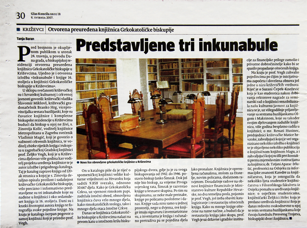 Povodom proslave 755. rođendana Grada Križevaca, kao i 230. obljetnice križevačke grkokatoličke biskupije, 24. travnja 2007. godine za javnost je otvorena knjižnica s inkunabulama i knjigama iz šesnaestog stoljeća. Zaslužni za otvaranje knjižnice su časna sestra Zinovija Kolić, viceprovincijalka, zatim Željko Vegh koji je vodio uređenje knjižnice i inventarizaciju knjiga, mr. Renata Husinec, predsjednica Matice hrvatske Križevci, dr. sc. Tatjana Aparac-Jelušić, Željkica Hrlec i ostali.