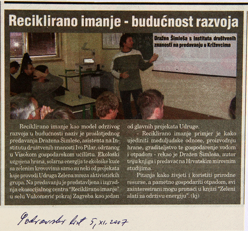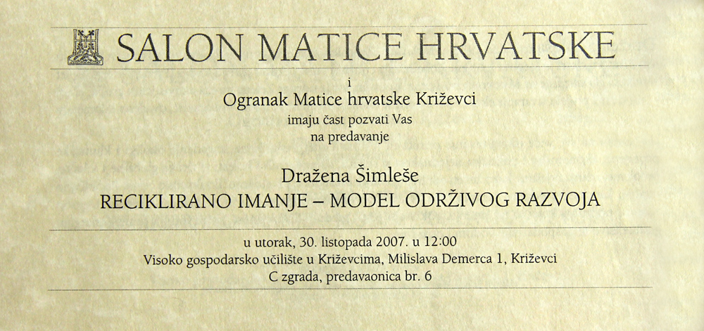 U utorak 30. listopada 2007. na Visokom gospodarskom učilišta u Križevcima, u organizaciji Ogranka Matice hrvatske Križevci, održano je predavanje Dražena Šimleše „Reciklirano imanje – model održivog razvoja”.