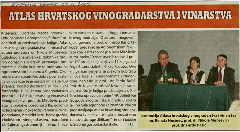 U podrumskoj dvorani Hrvatskoga doma 18. studenog 2009. Ogranak Matice hrvatske u Križevcima te Udruga vinogradara i vinara „Bilikum”, uz 149. obljetnicu osnutka Poljoprivrednoga učilišta u Križevcima, organizirali su predstavljanje knjige „Atlas hrvatskog vinogradarstva i vinarstva” prof. dr. sc. Nikole Miroševića i suradnika. Knjigu je predstavio sam autor te prof. dr. sc. Ferdo Bašić, nakon čega je uslijedila degustacija vina te promotivna prodaja drugih izdanja autora.