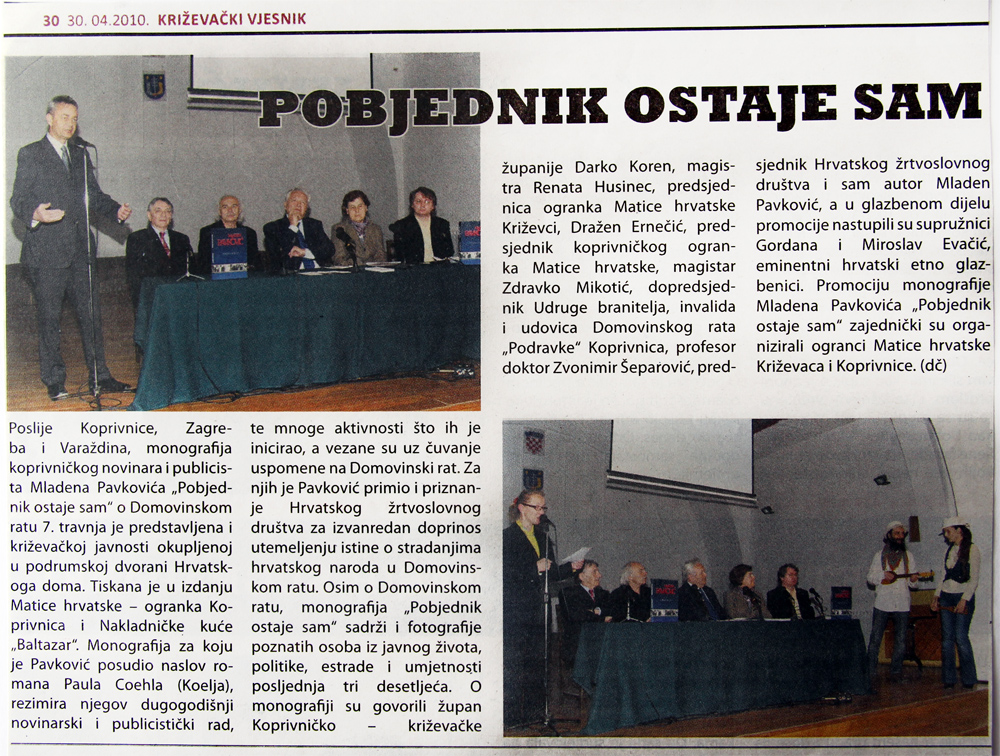 Križevački i koprivnički Ogranak Matice hrvatske organizirali su u podrumskoj dvorani Hrvatskoga doma 7. travnja 2010. predstavljanje knjige Mladena Pavkovića Pobjednik ostaje sam. Govorili su Darko Koren, župan Koprivničko-križevačke županije, Renata Husinec, predsjednica Ogranka MH u Križevcima, Dražen Ernečić, predsjednik Ogranka MH u Koprivnici, Zvonimir Šeparović, predsjednik Hrvatskog žrtvoslovnog društva, Zdravko Mikotić, dopredsjednik UBIUDR-a te Mladen Pavković, autor. Glazbeni doprinos dali su etnoglazbenici Miroslav i Gordana Evačić. Voditeljica programa bila je Danica Čataj.