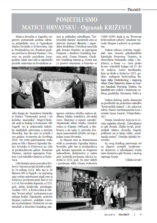 Dvadeset i šest članova Matice slovačke u Zagrebu posjetilo su je 31. svibnja 2014. Križevce. Ogranak Matice hrvatske u Križevcima i Matica slovačka u Zagrebu već petnaestak godina održavaju prijateljske veze. Slovački su matičari obišli najznamenitije križevačke kulturno-povijesne spomenike, Glogovnicu i Kalnik, a s posebnim su zanimanjem u prostorijama križevačkog ogranka razgledali izložbu posvećenu 100. obljetnici smrti Franje Markovića, koju je u povodu Dana grada Križevaca postavio Stjepan Sučić, potpredsjednik Matice hrvatske.