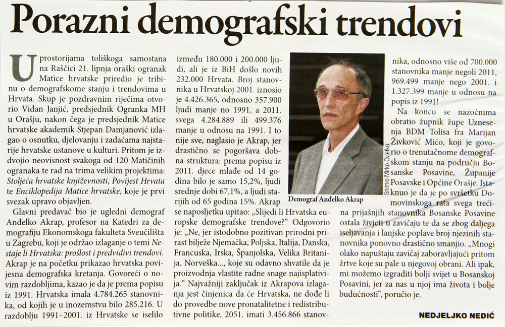 Ogranak Matice hrvatske u Križevcima održao je 19. ožujka 2015. u Velikoj gradskoj vijećnici tribinu „Nestaje li Hrvatska?”. Gost tribine bio je prof. dr. sc. Anđelko Akrap, demograf s Ekonomskog fakulteta Sveučilišta u Zagrebu, a tribinu je moderirala mr. sc. Renata Husinec.