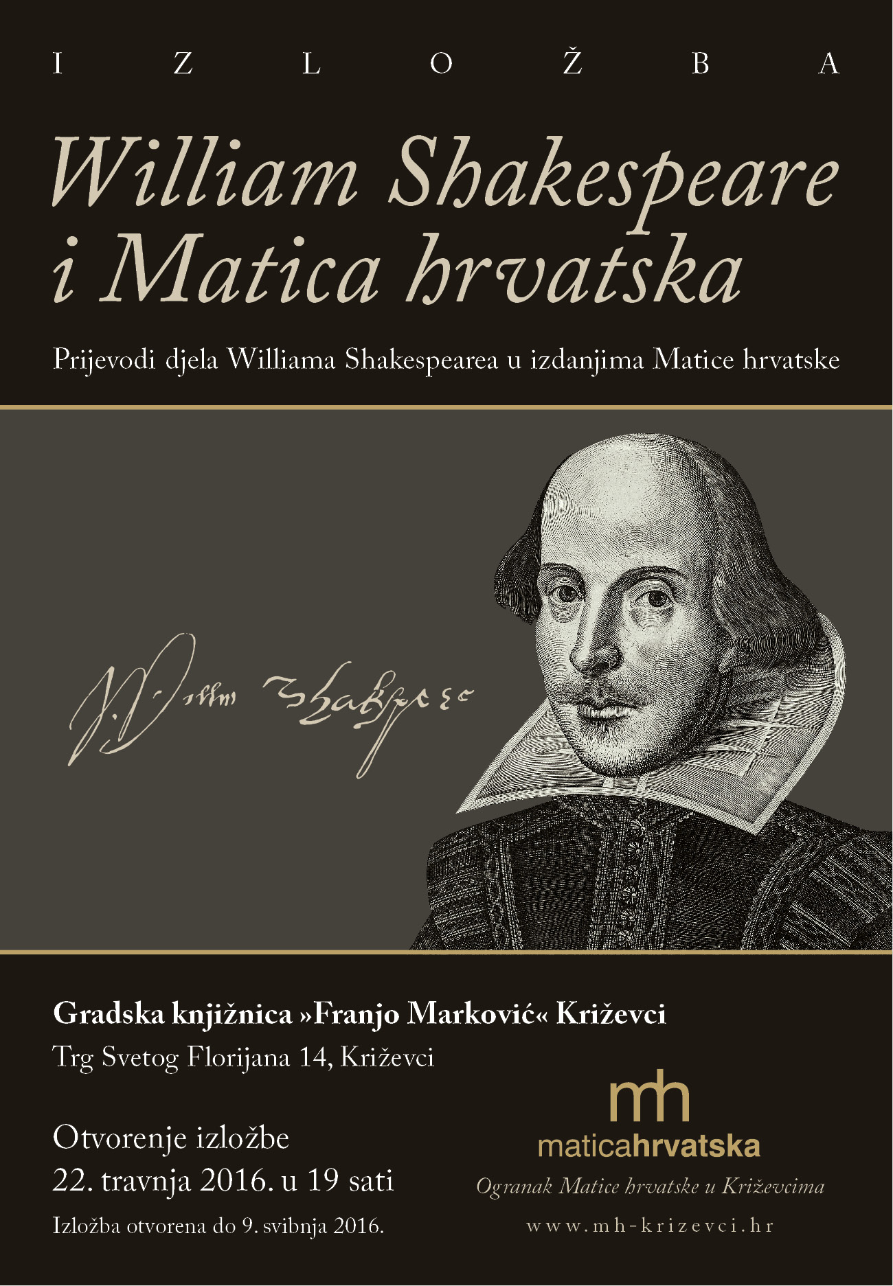 U suradnji s Gradskom knjižnicom „Franjo Marković” priređena je izložba knjiga prijevoda Shakespeareovih djela u izdanjima Matice hrvatske pod nazivom Shakespeare i Matica hrvatska. Izložba je otvorena u 19 sati u Multimedijskom centru u Križevcima i za tu prigodu