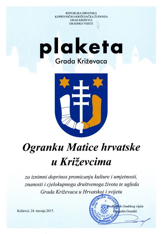 Na svečanoj sjednici Gradskoga vijeća Grada Križevaca održanoj 24. travnja 2017. godine povodom Dana Grada Križevaca predsjednik Gradskoga vijeća Dragutin Guzalić uručio je OMH u Križevcima Plaketu Grada Križevaca za izniman doprinos promicanju kulture i umjetnosti, znanosti i cjelokupnoga društvenoga života te ugleda Grada Križevaca u Hrvatskoj i svijetu.