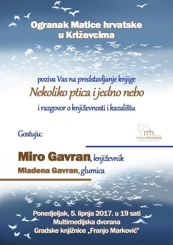U ponedjeljak, 5. lipnja 2017. u multimedijskoj dvorani Gradske knjižnice “Franjo Marković” Ogranak Matice hrvatske u Križevcima organizirao je razgovor o književnosti i kazalištu s Mirom Gavranom te predstavljanje njegove najnovije knjige Nekoliko ptica i jedno nebo. Ulomke iz knjige čitala je glumica Mladena Gavran, a razgovor je moderirala Danijela Zagorec.