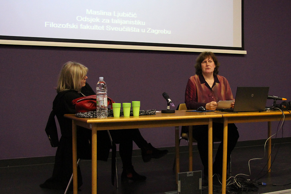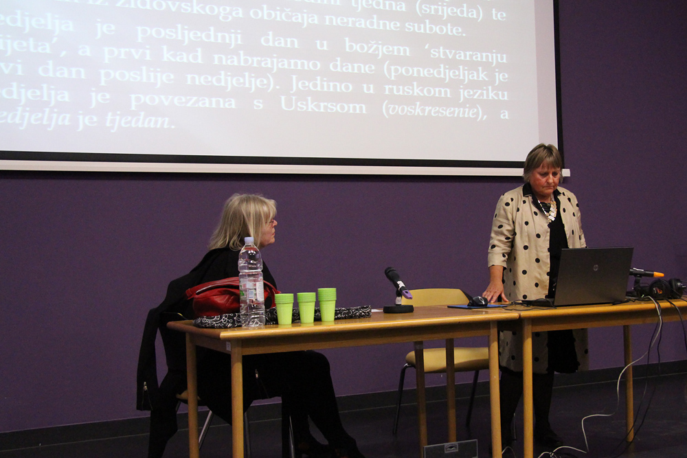 Uslijedile su tri sesije jezikoslovnih izlaganja. U prvoj su sesiji, kojom je predsjedavala Zrinka Jelaska, izlagali Ranko Matasović (Odsjek za lingvistiku Filozofskoga fakulteta u Zagrebu), Neda Pintarić (Katedra za poljski jezik i književnost Filozofskoga fakulteta u Zagrebu), Maslina Ljubičić (Odsjek za talijanistiku Filozofskoga fakulteta u Zagrebu), Krunoslav Puškar (OŠ Ljudevita Modeca Križevci) i Bojan Marotti (Zavodu za povijest i filozofiju znanosti HAZU-a).