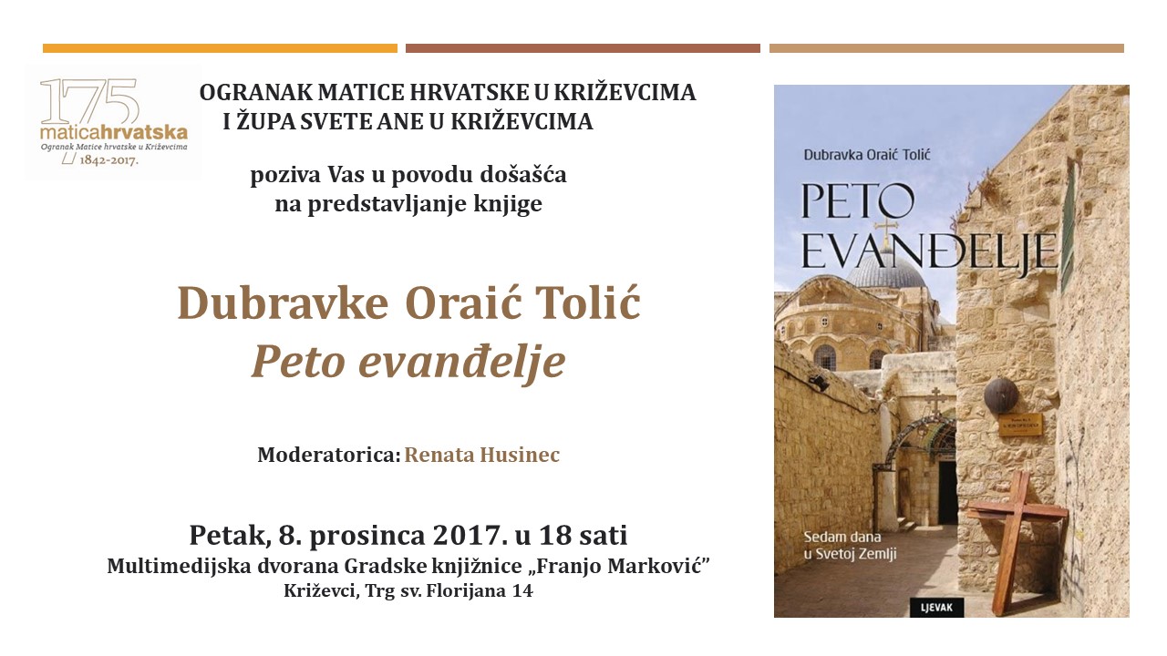 Nakon stručnih vodiča i studija o Svetoj Zemlji (Adalbert Rebić, fra Miroslav Modrić) te brojnih novinskih i internetskih zapisa s turističkih putovanja i hodočašća, knjiga Dubravke Oraić Tolić Peto evanđelje: Sedam dana u Svetoj Zemlji prvi je suvremeni književni putopis u nas o posjetu biblijskim mjestima i Izraelu. Efektni naslov citat je poznate sintagme Ernesta Renana iz studije Život Isusov.