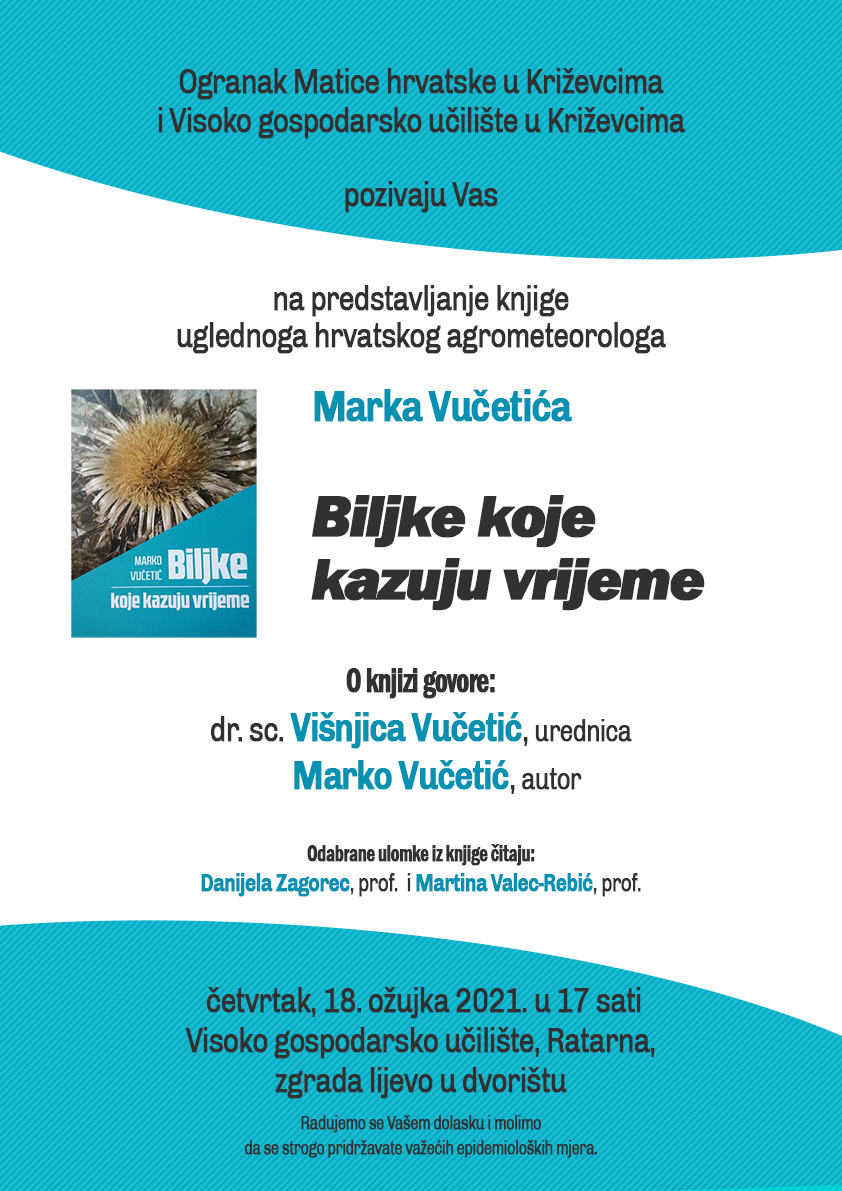 Ogranak Matice hrvatske u Križevcima i Visoko gospodarsko učilište u Križevcima organizirali su u četvrtak 18. ožujka 2021. u 17 sati predstavljanje knjige uglednoga hrvatskog agrometeorologa Marka Vučetića Biljke koje kazuju vrijeme. O knjizi su govorili urednica knjige dr. sc. Višnjica Vučetić i autor Marko Vučetić. Odabrane ulomke iz knjige čitale su profesorice Martina Valec-Rebić i Danijela Zagorec.