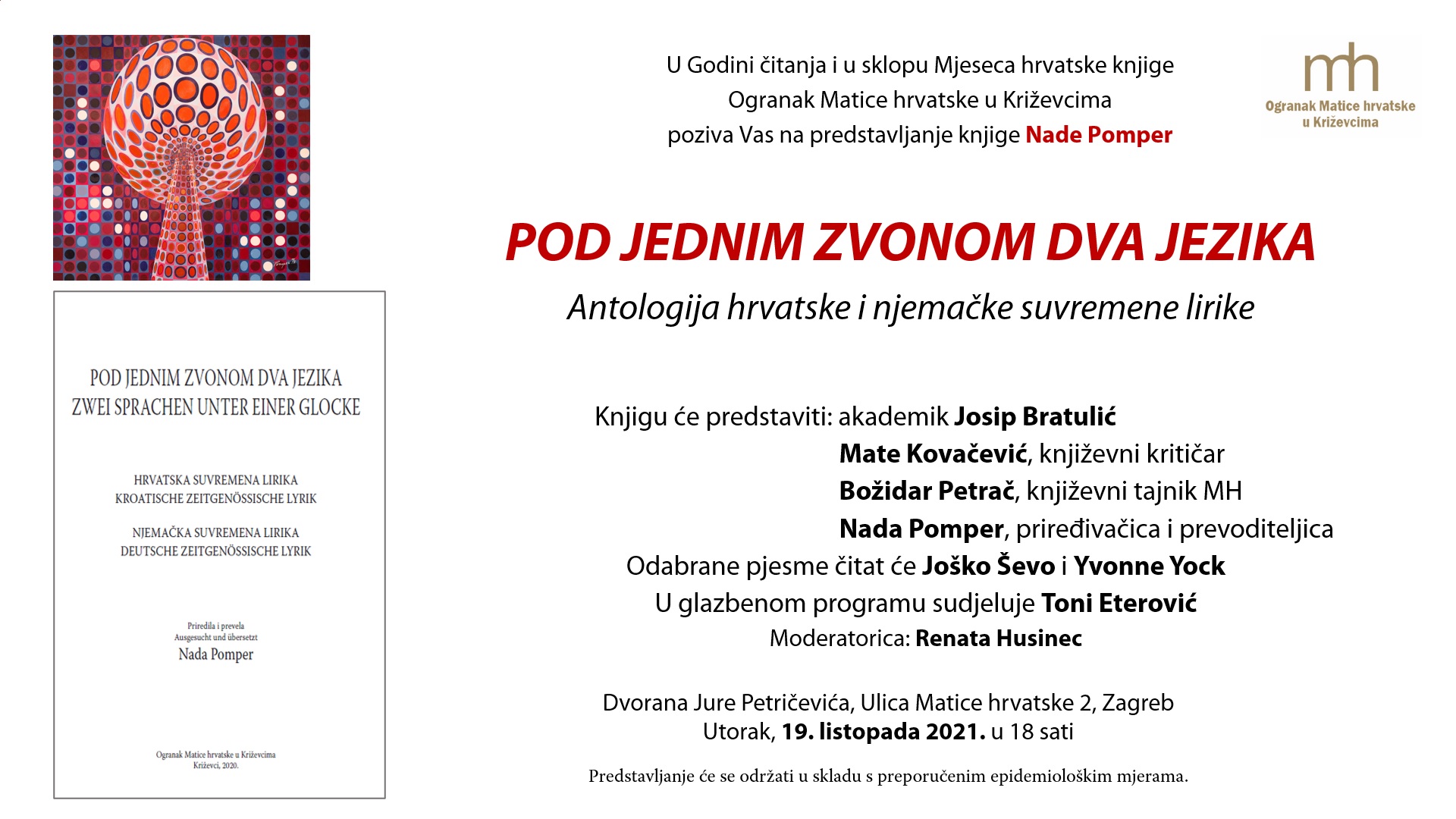 U Godini čitanja i u sklopu Mjeseca hrvatske knjige Ogranak Matice hrvatske u Križevcima organizirao je 19. listopada 2021. u Zagrebu u Središnjici Matice hrvatske predstavljanje knjige Nade Pomper Antologija hrvatske i njemačke suvremene lirike / Anthologie der kroatischen und deutschen zeitgenössischen Lyrik pod nazivom Pod jednim zvonom dva jezika / Zwei Sprachen unter einer Glocke.