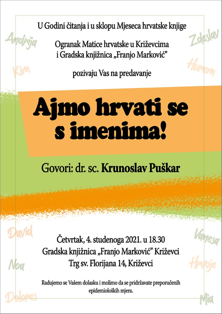Križevčani su s velikim zanimanjem u četvrtak, 4. studenoga 2021. u Multimedijskoj dvorani Gradske knjižnice „Franjo Marković” pratili predavanje koje je održao dr. sc. Krunoslav Puškar na temu „Ajmo hrvati se s imenima”. Organizator je bio Ogranak Matice hrvatske u Križevcima pa se uvodno obratila predsjednica Ogranka mr. sc. Renata Husinec.