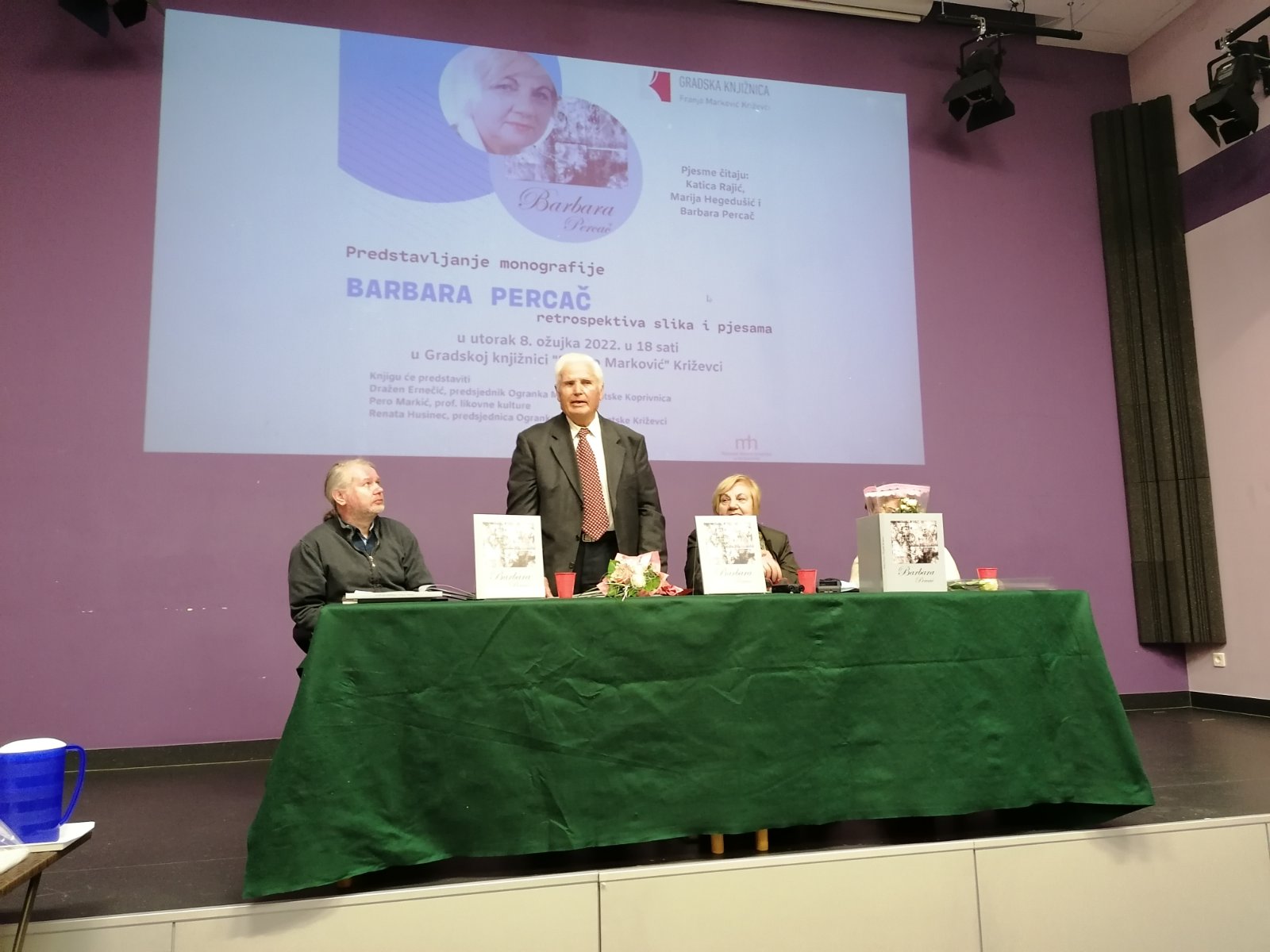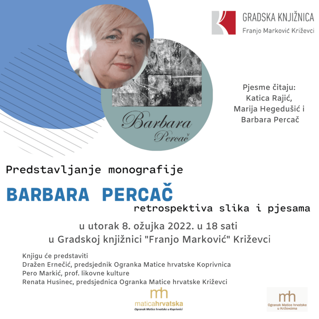 Dvostrukim događanjem u Gradskoj knjižnici Franjo Marković u Križevcima u prigodi Međunarodnog dana žena, u utorak 8. ožujka 2022. predstavljena je iznimna žena slikarica i pjesnikinja Barbara Percač. Na studijskom odjelu Knjižnice otvorena je izložba slika, akrila, akvarela i kombiniranih tehnika, dok je istovremeno u Multimedijskoj dvorani održano predstavljanje monografije koja je objavljena 2020. godine.